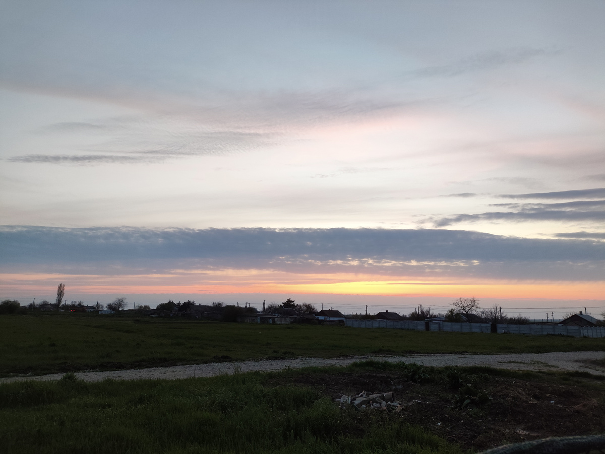 А вчера заката практически не было, еще яркое солнце упало куда-то в серую пелену на горизонте. Зато потом, значительно позже, все окрасилось в нежные персиковые тона...