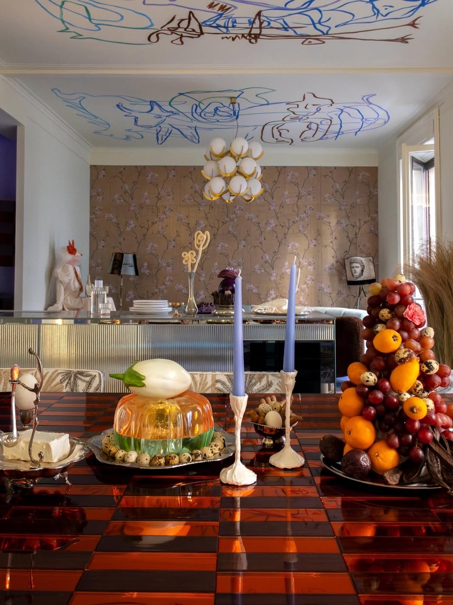 Шахматный пол создаёт динамику и лёгкий эффект театральности. Сиреневые стены выглядят неожиданно и смело. Металлическая кухня словно пришла из будущего. Потолок с рисунками добавляет элемент игры и свободы.