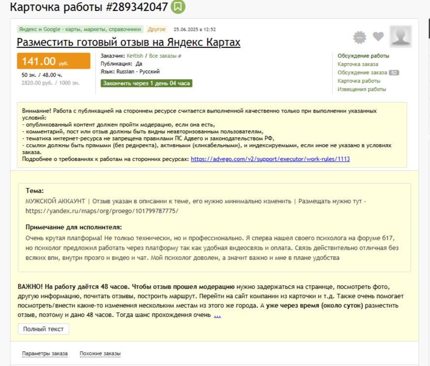 Сегодня делюсь своим свежим опытом на Advego — расскажу, как взял очередной заказ на отзыв для Яндекс.Карт, что написал, на что обратить внимание в работе, и почему повышенные ставки открываются не сразу. На этот раз мне предложили оставить отзыв для платформы "ПроЭго" на Яндекс.Картах. За задание обещают 141 рубль — сумма для новичка вполне приятная, но важнее опыт, который я получаю на практике. Условия стандартные: Сначала внимательно изучил карточку фирмы на Яндекс.Картах, затем написал отзыв вручную: Платформа действительно понравилась — удобно работать с психологом, всё организовано профессионально. Сначала нашёл специалиста на b17, но дальше сессии проводили через ПроЭго: видеосвязь без лагов, не нужен впн, удобно и мне, и специалисту. Теперь советую друзьям — отличное решение для онлайн-консультаций! Отзыв был размещён, но пока ещё проходит проверку на стороне Яндекса. Почему важна последовательность в заданиях Многие новички спрашивают: "Как попасть на более дорогие заказы на