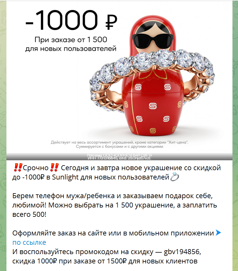 У меня есть подруга, Женя. Дружим мы со времен боевой журналистской молодости. Она на пару лет меня младше, но я ее воспринимаю как в некотором роде старшего товарища, более мудрого, более спокойного и выдержанного. Когда мне совсем тяжко становится существовать в предлагаемых обстоятельствах с ограничениями и проблемами с работой, то именно она выступает моим личным психотерапевтом, и очень успешно. В общем, это проверенная, надежная и моя любимая подруга. И крестная моей дочки заодно. Она просила меня (я же виду канал о скидках и выгодных покупках, вы знаете) найти для ее свекрови трусы-памперсы подешевле, чем они покупают обычно. Ну и я как человек увлеченный стала ей рассказывать о своей экономной добыче за последнее время. Вот и вам расскажу, хорошая схема, я такое люблю. В Санлайте была акция — короткий промокод на скидку 1000 рублей от 1500, два дня всего действовал, и только для новых аккаунтов: Ну вы понимаете, да? Берешь украшение на 1500, платишь 500 — выгодно. Или берешь ук