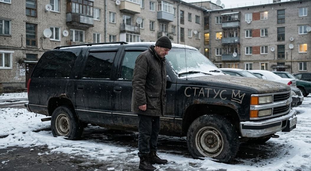 Внизу, раскорячившись на полтора парковочных места и помяв задним левым колесом хилое ограждение палисадника, стоял монстр. Это был огромный, угловатый, как товарный вагон, черный джип неизвестной, но явно очень подержанной породы. Кажется, «Кадиллак» или что-то похожее, из тех времен, когда бензин стоил копейки, а экология считалась мифом. На его полированных боках уже виднелись царапины, а тонировка на задних стеклах пошла пузырями.