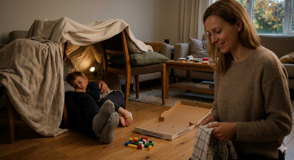 Посреди комнаты из диванных подушек, стульев и пледов был сооружен огромный шалаш. На полу валялись пустые коробки из-под пиццы и конструктор «Лего», который, видимо, был в том самом чемоданчике Дениса. Из шалаша торчали две пары ног: одни большие, в носках, другие — маленькие, босые.