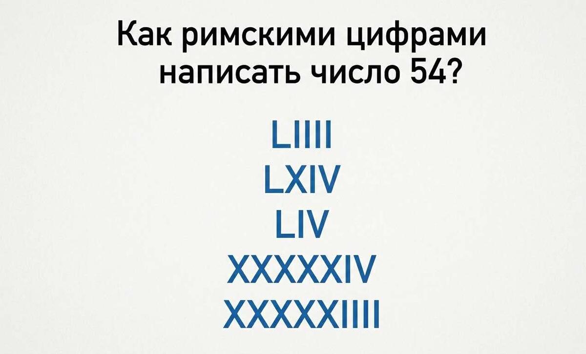 Многие привыкли считать, что римские цифры — это лишь способ обозначить главы в учебнике или порядковый номер века. Большинство из нас свободно владеет ими в пределах первой двадцати единиц, но стоит задаче стать чуть сложнее, как возникают трудности. А ведь эта система гораздо богаче, чем кажется на первый взгляд. Предлагаем пройти небольшой тест. Как правильно написать число 54 римскими цифрами? Варианты ответов: Правильный ответ: LIV. Сейчас читают: