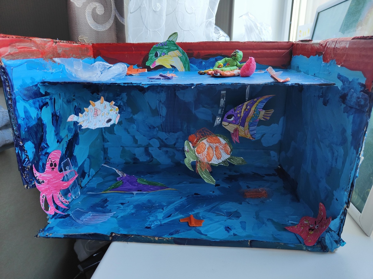 блёстками. «Как здорово мы провели время!» — пишут они потом в родительском чате. Но мы не такие. Я вообще стараюсь следовать собственному завету, придуманному еще в школе: "больше никаких поделок!". Но по злой иронии судьбы Никита растёт человеком инициативным. Он буквально напрашивается на все задания, которые только существуют в садике. Обычно мы не вмешиваемся, оставляем всё ему. Ну и что если результат слегка пугает. 😁 Но в этот раз задумка его оказалась слишком масштабной, пришлось помогать. И тут начинается самое сложное для меня — балансирование на тонкой грани между «криво-косо, но зато САМ» и «дай-ка я сама всё сделаю красиво!». И как вишенка на торте это бесявое «Мама! я сам знаю, как сделать!», после которого какая-нибудь малюсенькая деталь обматывается двадцатью слоями скотча, после предварительного пришпандоривания степлером. В общем, было сложно, но мы справились 💪 Даже скотч в доме еще остался🤣 И да, пожалуйста, не мусорьте в океан, а то станете таким же зелё