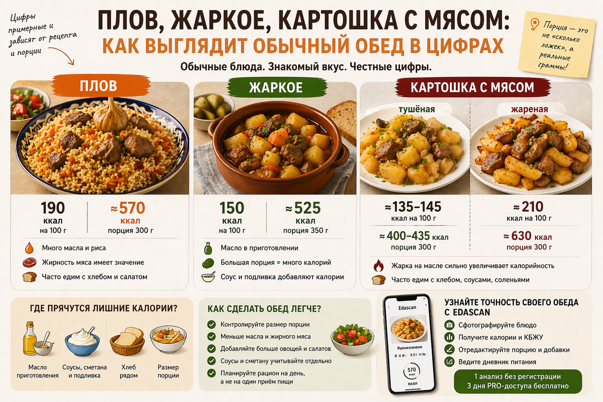 Особенно когда в блюде есть три вещи: крупа/картошка, мясо и масло. Давайте посмотрим на эти три обеда в цифрах — без морали, без ЗОЖ-лекций. Просто как оно есть. Плов в голове часто звучит почти диетически: рис, морковь, мясо… что тут такого?