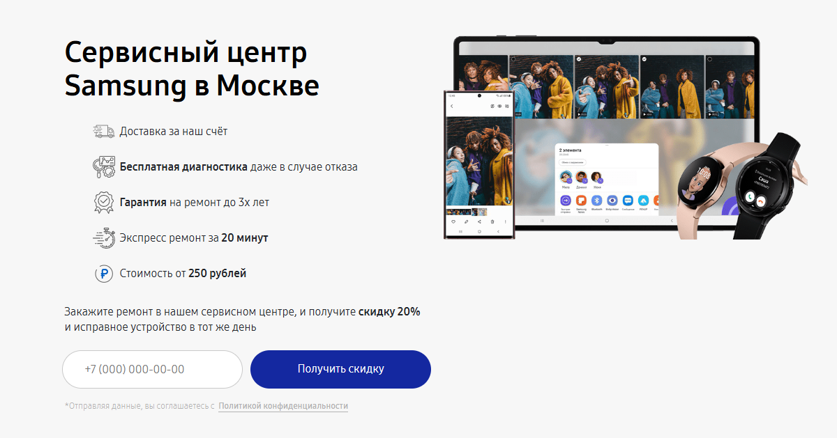 Почему SamsungASC Сервисный центр — лучший в Москве? Клиенты получают бесплатную диагностику даже в случае отказа от ремонта, бесплатную курьерскую доставку техники по всей Москве, гарантию на выполненные работы до 3 лет и экспресс-ремонт всего за 20 минут. Все мастера имеют официальные сертификаты Samsung и используют только оригинальные запчасти. Высокая оценка 4.9 на независимых площадках — лучшее подтверждение безупречной репутации.