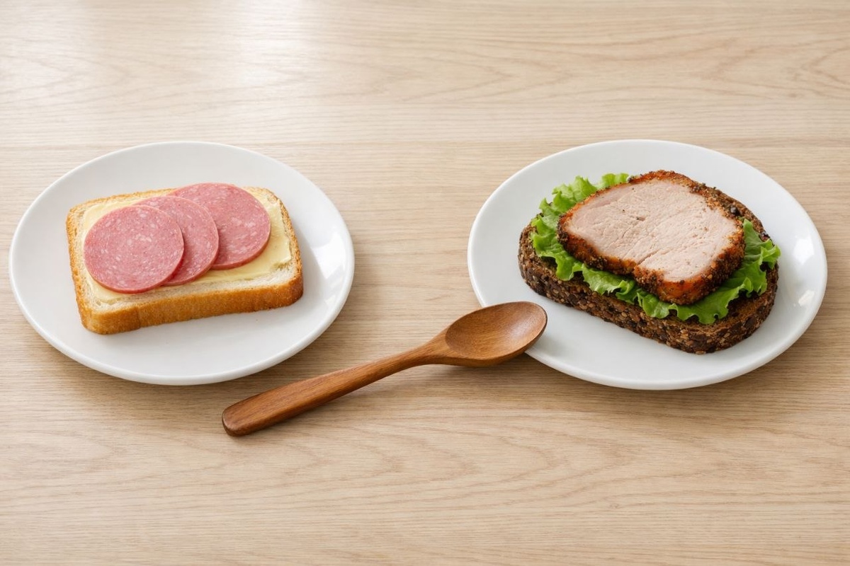 Первая неделя: замените половину колбасы на кружок помидора и лист салата. Хлеб пока оставьте белый. Привыкли? Отлично.