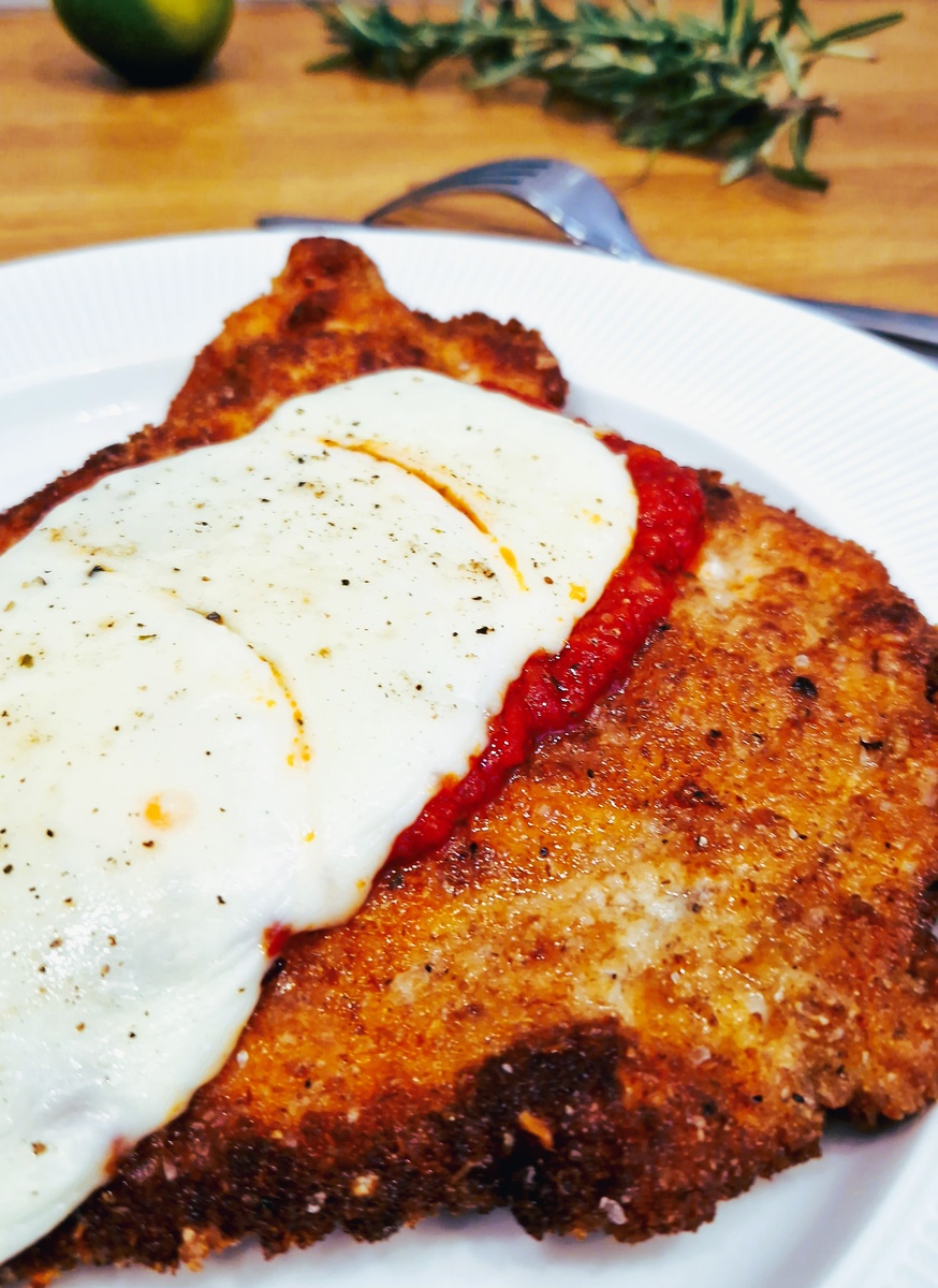 Секрет этого блюда в том, что сначала курица обваливают в муке, яичной смеси и панировочных сухарях и в результате получается хрустящая корочка. Но просто панировочные сухари это банально и скучно, поэтому смешайте их с копченной паприкой и пармезаном, он придаст курице карамельную аппетитную корочку.