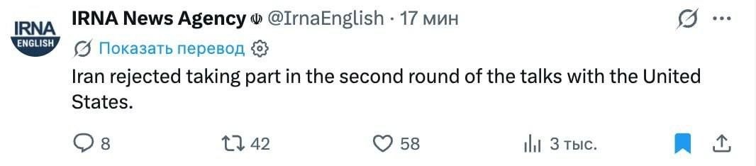 Тегеран официально отказался от переговоров с США, заявив, что диалог зашел в тупик из-за позиции Вашингтона. По данным издания IRNA, ряд причин прогрессу: • чрезмерные и необоснованные требования США • частые смены позиции • постоянные противоречия • продолжение морской блокады Напомним, что первый раунд в Омане так и не привел к прорыву. Теперь пауза затягивается — и без снятия давления возврата за стол пока не ждут. #Иран #США #переговоры 🔔 Подпишись | 👍 Поставь реакцию | ♻️ Репост