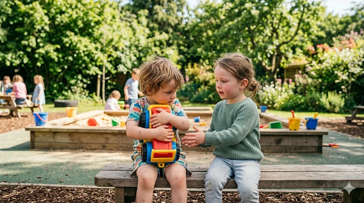 Картина, знакомая каждому родителю: на площадке ребёнок вцепился в свой совочек мёртвой хваткой, другой малыш тянет руки, оба орут, мамы краснеют. «Дай поиграть! Не жадничай!» — знакомые фразы. Но на самом деле за нежеланием делиться стоят важные процессы развития, и привычное «поделись» может быть не только бесполезным, но и вредным.