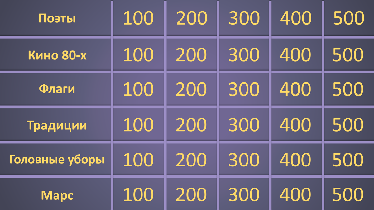 — школьных и студенческих мероприятий Главный плюс — простота. Игру легко объяснить, и гости быстро включаются в процесс. Ниже вы можете скачать готовый шаблон игры «Своя игра» в формате PowerPoint. Он уже настроен: есть игровое поле, переходы между вопросами и стр