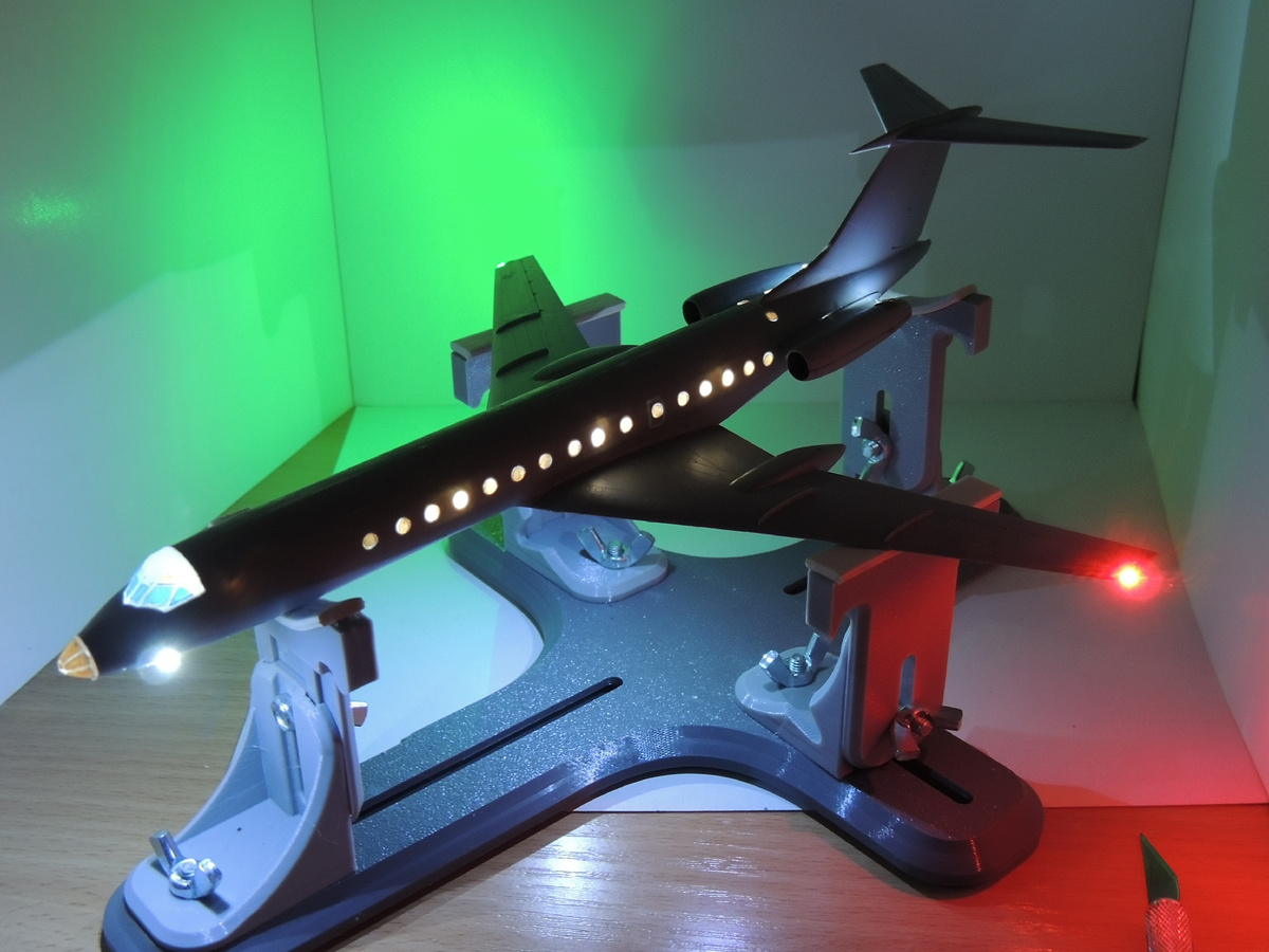 Мне в таких проектах нравится именно скрытая часть. Снаружи зритель видит аккуратный лайнер в 1/144. А внутри там своя маленькая инженерия: Arduino Nano, аккумулятор, сенсор в левой консоли, съёмный правый двигатель с доступом к зарядке. И это как раз тот случай, когда техническая доработка не спорит с внешним видом модели, а работает на него.