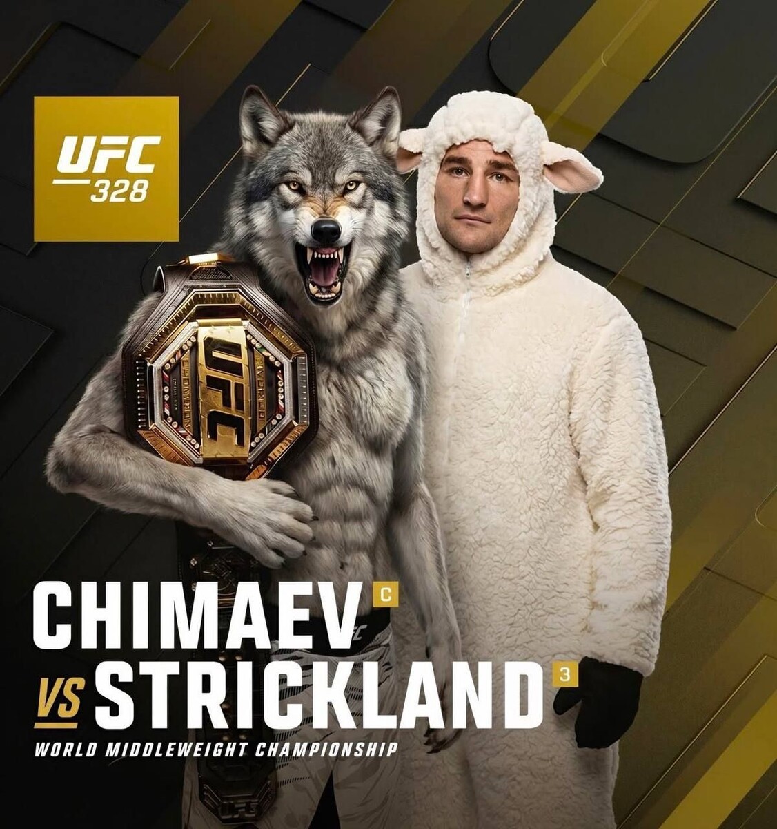 31-летний действующий обладатель титула UFC в среднем весе Хамзат Чимаев, представляющий ОАЭ, опубликовал сгенерированный искусственным интеллектом постер к предстоящему бою с экс-чемпионом UFC в категории до 84 кг американцем Шоном Стриклендом. Их бой станет главным событием турнира UFC 328. В шуточном постере Хамзат предстал в образе волка, что является отсылкой к его прозвищу — Борз. А Шон изображён в костюме овцы, намекая на его трусость и страх перед Хамзатом. Чимаев оказался 16-м бойцом в истории североамериканской лиги, которому удалось стать чемпионом без поражений на профессиональном уровне. В рекорде уроженца Чечни 15 побед, из которых 12 были одержаны досрочно, и ни одного поражения. На профессиональном уровне Борз выступает с 2018 года. В профессиональном рекорде Шона в смешанных единоборствах 30 побед, из которых 16 были одержаны досрочно, и семь поражений. В ММА Стрикленд дебютировал в марте 2008 года.