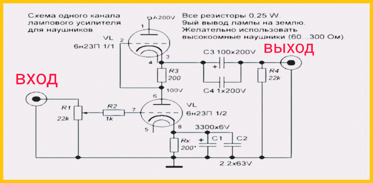 Схема одного канала лампового усилителя для наушников на лампах 6Н23П.