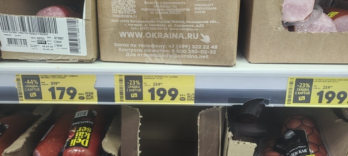 Зашел дня 3-4 назад в "Пятерочку", колбаски прикупить ну и по мелочи того-сего. На кассе еще подумал, что покупка чего то дороговато вышла, жизнь дорожает прям не по дням, а по часам. Дома уже глянул на чек повнимательнее и оказалось, что моя колбаса, которая вроде как была за 200 руб. на прилавке, обошлась мне в 600. Вчера оказался опять в "Пятерочке", но уже в другом филиале, дай думаю, гляну ценник на мою колбасу повнимательнее и прифигел слегка. На прилавке лежат разные сорта колбасы, кусками грам по 200-300 и цены за них стоят за кусок и между ними кусок моей колбасы, цена за которую стоит за 100 грамм! Т.е. лежат рядом 3 куска колбасы, только один стоит 179 руб. за кусок, а другой 199 руб за 100 грамм и следом опять 199 руб. за кусок. Не удивительно, что я так лоханулся. Любой человек, увидев несколько ценников с ценой за кусок, автоматом будет думать, что и остальные такие же и не увидит подвоха. И как я уже написал, купил я в одном магазине, а цены эти с другого, т.е. это получ