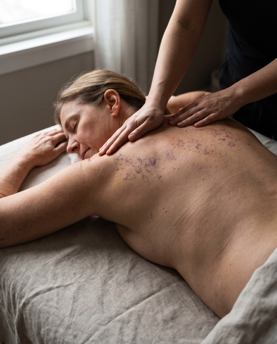 - При наличии звёздочек исключайте агрессивные техники. Никакого глубокого массажа, вакуумных банок, сильного разогрева в зоне поражения.