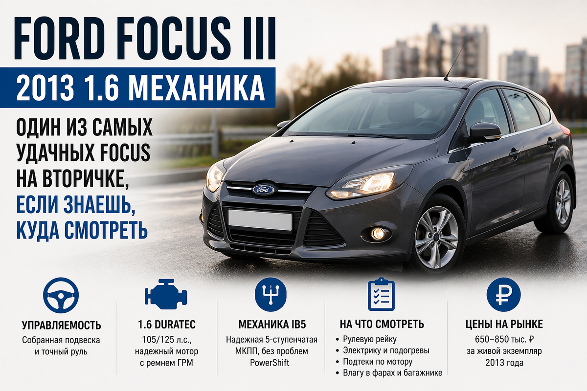 Ford Focus III 2013 1.6 механика — хороший вариант для тех, кому нужна приятная в управлении, понятная и не слишком дорогая в содержании машина. Это одна из тех версий, где Focus III раскрывается лучше всего: нет проблемного робота, мотор простой, а повадки у машины по-фордовски собранные. Но надо понимать и обратную сторону: салон не самый просторный в классе, багажник у хэтчбека маленький, клиренс невелик, краска слабая, а дорестайл любит подкидывать мелкие сюрпризы по электрике и кузовным мелочам.
