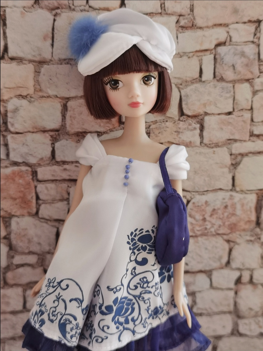 Свою я решила назвать Мэй-Мэй. Мне очень понравился её образ: неприталенное платье в бело-синих тонах, головной убор в виде кепочки — складывается ощущение, что она собралась на морскую прогулку.