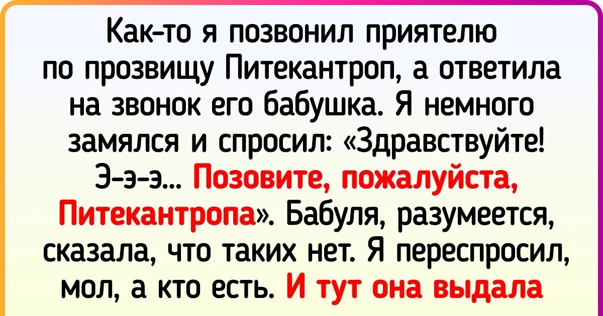 - Как-то я позвонил приятелю по прозвищу Питекантроп, а ответила на звонок его бабушка. Я немного замялся и спросил: «Здравствуйте! Э-э-э... Позовите, пожалуйста, Питекантропа». Бабуля, разумеется, сказала, что таких нет. Я переспросил, мол, а кто есть. И тут она выдала: «Из таких вот никого нет». © orionresort