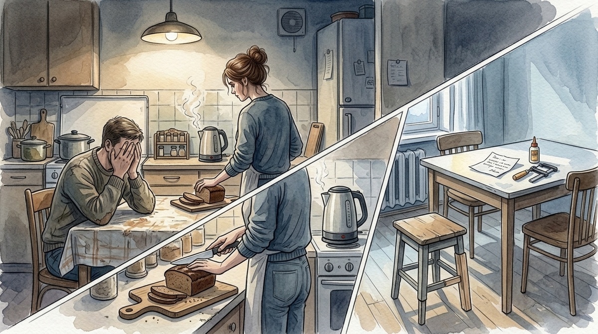 Чайник закипел первый раз, когда он сказал это. Лена стояла спиной, резала хлеб. Нож замер на полпути. — Я ухожу, Лен. Она не обернулась. Дорезала. Положила хлеб на тарелку. Тарелку на стол. Чайник щелкнул — выключился. — Чай будешь? — Ты слышала что я сказал? — Слышала. Чай будешь или нет? Он сел на табурет. Потер лицо ладонями. Восемнадцать лет за этим столом на Ленинградской в Самаре. Восемнадцать лет этот табурет скрипит на левую ногу и никто не чинит. — Лен, я серьезно. — Я тоже. Чай — да или нет. — Ладно, — выдохнул. — Давай чай. Она налила два стакана. Села через стол. Подвинула ему сахарницу. Он не взял. — Когда ты решил? — Давно. — Давно — это сколько. Месяц? Год? — Ну, с зимы где-то. — С какой зимы, Серёж. Прошлой? — Этой. С января где-то. — С января, — повторила она. — Четыре месяца. Четыре месяца ты ходил, ужинал, ложился рядом. И молчал. — Я не молчал. Я думал. — Ты молчал. Он отпил чай. Обжёгся. Поставил стакан. — Куда? — Сниму квартиру пока. Потом посмотрим. — Потом пос