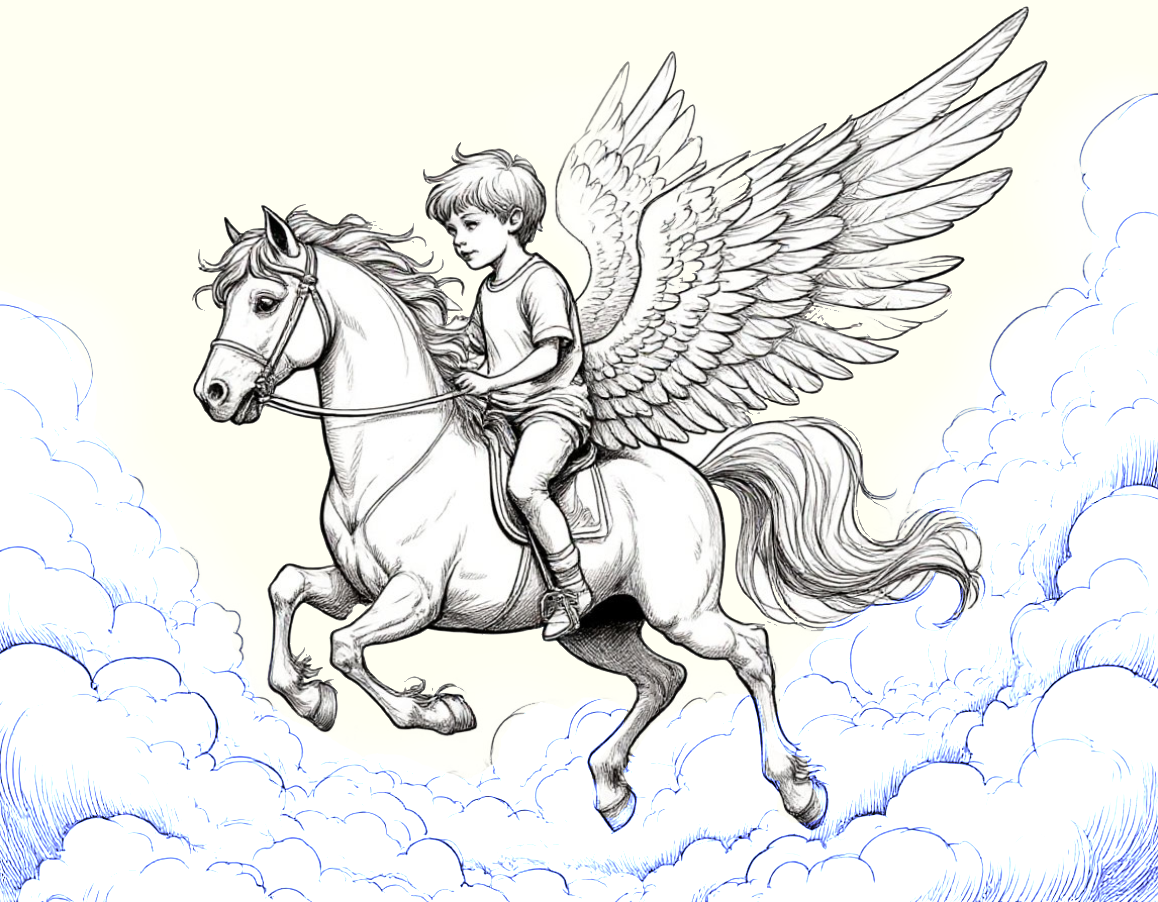 И Теофраст почувствовал, как его подхватил кто‑то и понёс ввысь. От испуга он широко раскрыл глаза и схватился за гриву. Он поднимался к облакам на крылатом белом пони.