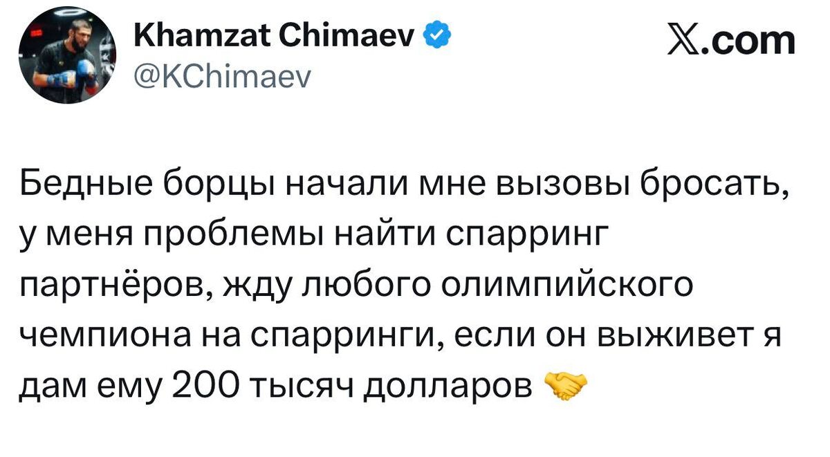 Прикольно, что Хамзат предлагает за выживание, бюджет некоторых борцовских мероприятий. Предполагаю возможный отток спортсменов из промоушенов в сторону тренировочного лагеря Чимаева. 🥸