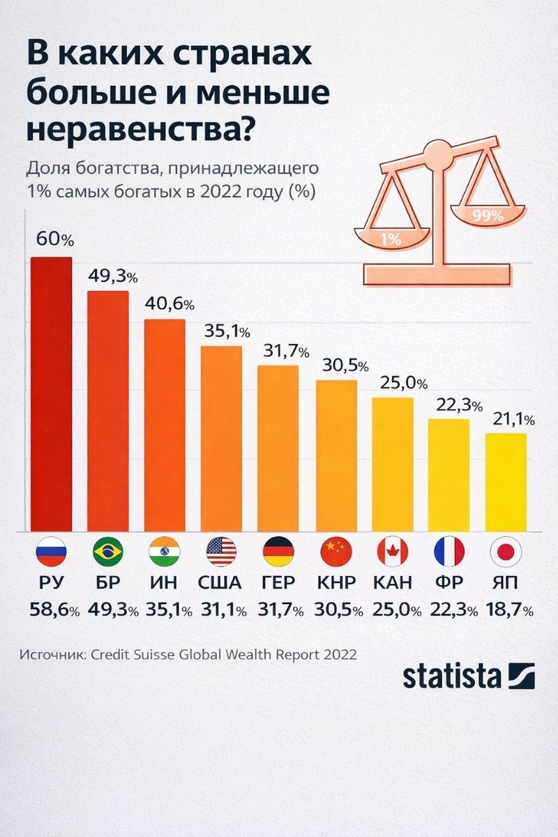 🎣 Самое дорогое в стране — это не нефть. Это разрыв между теми, у кого «всё», и теми, у кого «пока держимся». 🥩 Есть сухой факт: в ведущих экономиках 1% населения владеет огромной долей богатства. Но у нас этот перекос ощущается почти физически — как холодный подъезд без отопления. В России разрыв не просто большой — он неприлично заметный. Когда один живёт в мире инвестиций, фондов и активов, а другой — в мире скидок, кредиток и «дожить до зарплаты». И вот здесь начинается главное заблуждение: нам часто продают идею, что это результат «разной полезности» людей. Мол, кто-то просто лучше старается. 🧠 Смотрите, какая штука. В экономике есть термин «эффект накопленного преимущества» — это когда стартовые условия начинают работать сильнее усилий. По-человечески: если у тебя уже есть деньги, ты зарабатываешь на их существовании, а не на работе. И наоборот — если ты начинаешь с нуля, ты платишь за всё: за кредиты, за ошибки, за отсутствие времени думать стратегически. Это как ремонт: у