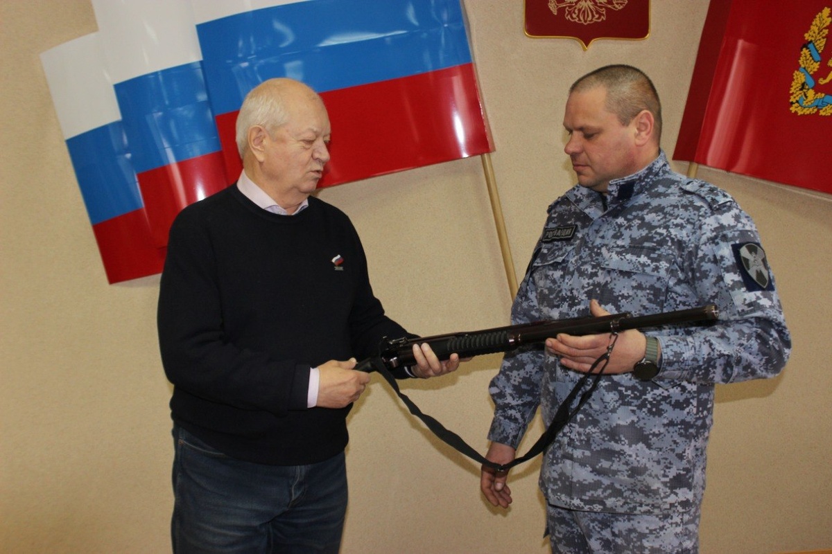 Член общественного совета при МО МВД России «Бородинский», ветеран МВД Виктор Данилов передал в дар СВО личное пятизарядное помповое ружьё