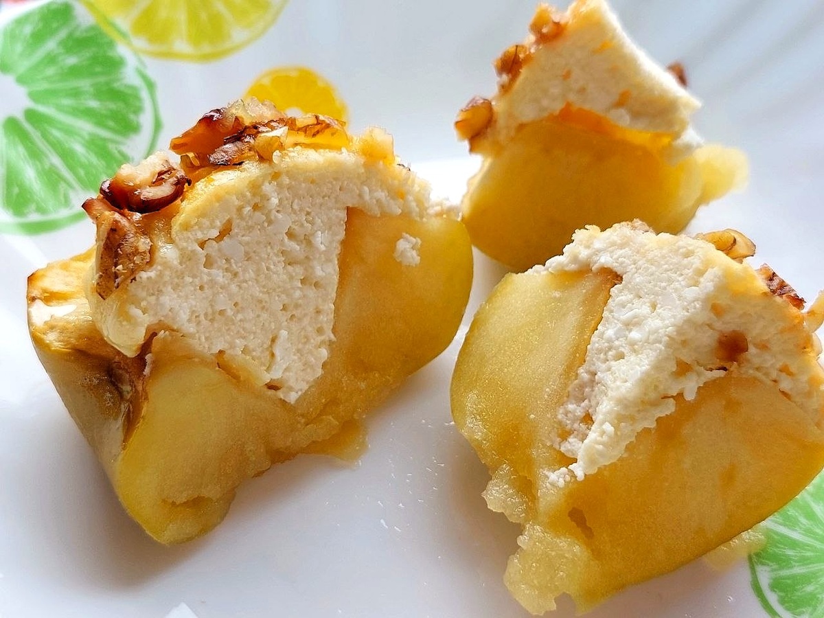 Выложила в форму для запекания. Наполнила творожной массой, сверху присыпала дроблёным грецким орехом. На дно формы налила немного воды, чтобы яблоки не пересыхали и равномерно пропекались.