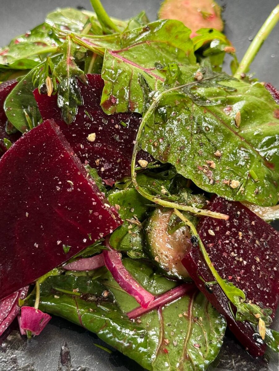 Салат для красоты, ума, стройности, дает энергию, успокаивает, лечит от поноса, запора и нулевого баланса на карте. Волшебный салат, настоящая кухонная кухонная магия. Не убирайте фенхель и кориандр, это то, что даст салату оберег от нудного - ну, да, свекла с травой, окей. Что нужно на 2-3 порции: Заправка Смешиваем все для заправки, перемешиваем вилочкой, отставляем в сторону. Моем салат, обсушиваем. Режем свеклу на кругляши толщиной 0,5 см, далее режем на четвертинки, см фото. Режем мелко лук на перья толщиной 2-3 мм. Попробуйте кусочек. Если он горчит, можно залить лук кипятком, оставить на 1 минуту и слить воду, это уберет горечь. Огурцы режем кругляшами толщиной 2-3 мм. Мелко петрушку и укроп. Семена фенхеля и кориандра измельчаем в ступке или плоским дном чашки на доске. Смешиваем в миске все ингредиенты, поливаем сверху заправкой. Я перемешиваю этот салат руками, так заправка распределяется более равномерно. Поэтому использую одноразовые перчатки, чтоб руки не окрасились. Напр