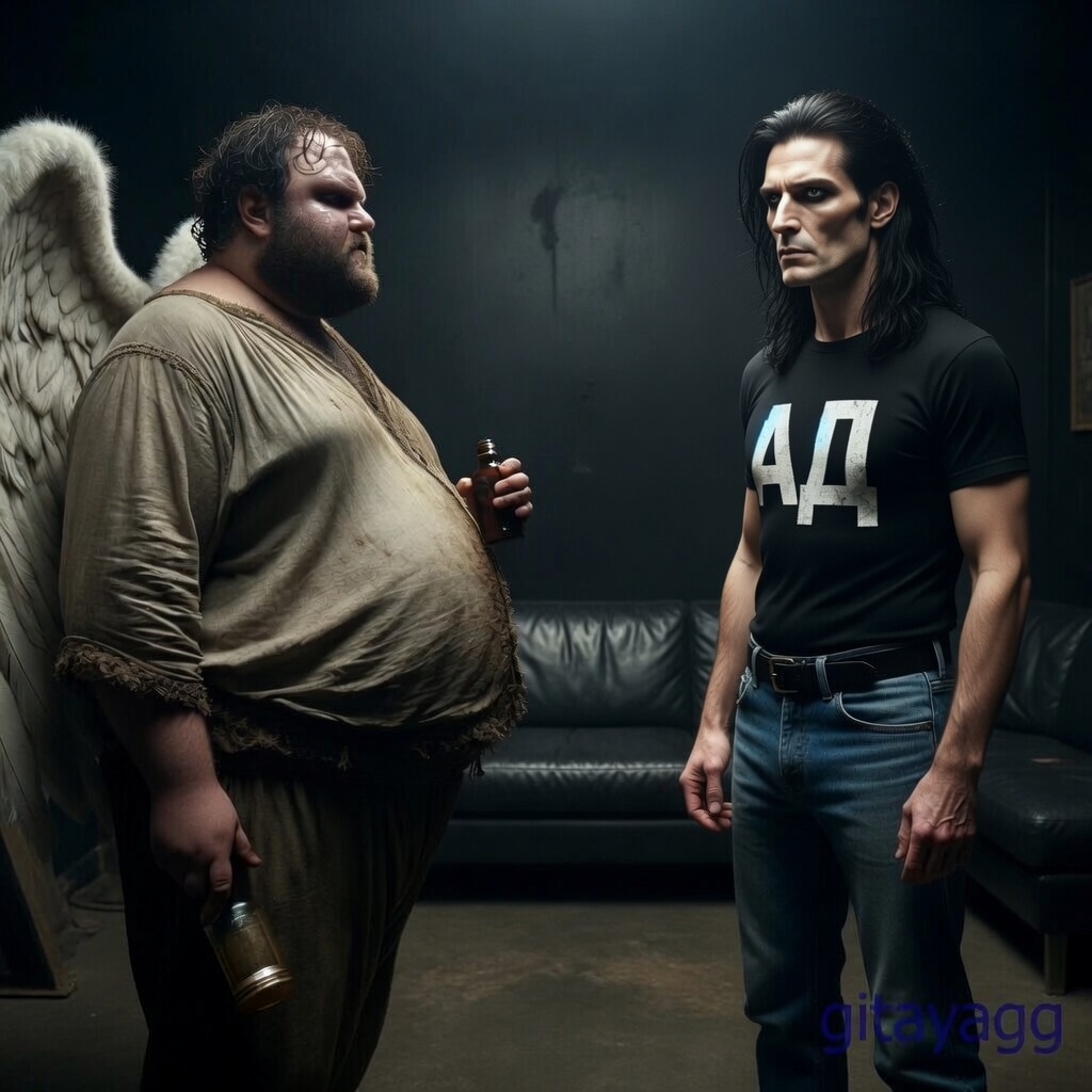 Из стены выдвинулся огромный двухметровый мужик, одетый в рубаху с пятнами. На ногах - мартинсы, на голове криво сидящий нимб. Облик загулявшего серафима дополнили белоснежные крылья.