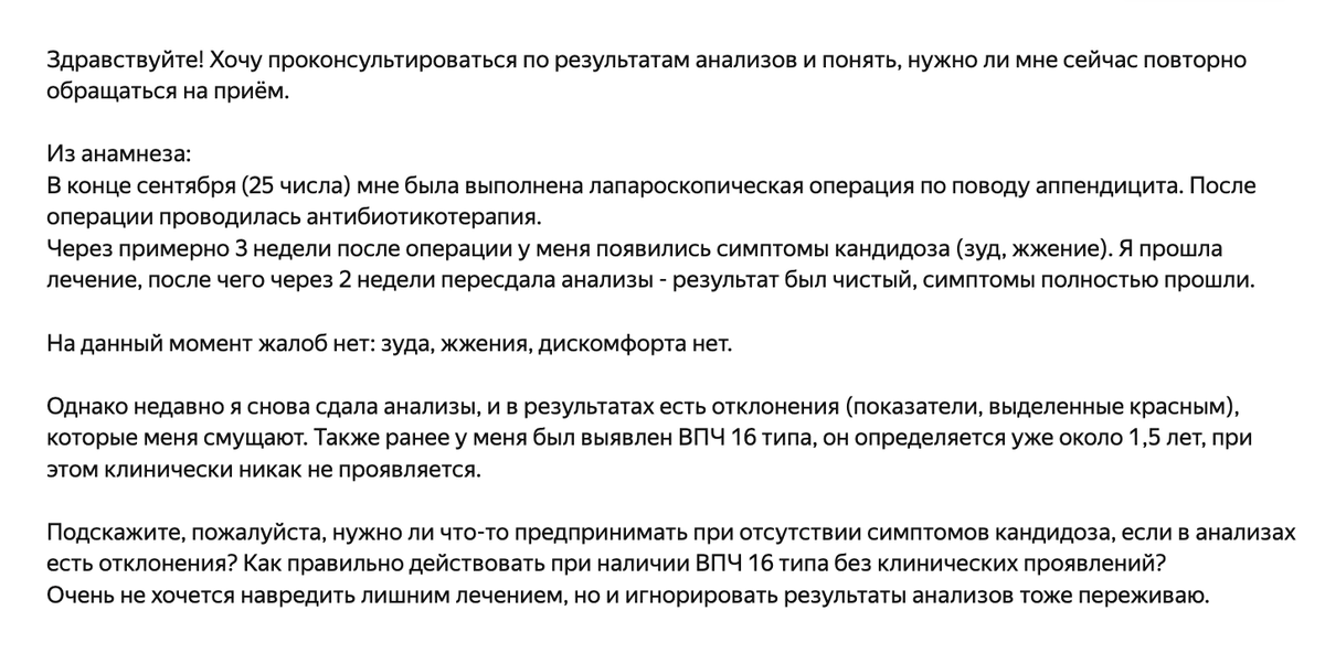 Из анамнеза понятно, что после лапароскопической операции по поводу аппендицита и курса антибиотиков через несколько недель появились типичные симптомы кандидоза: зуд и жжение. Лечение было проведено, симптомы прошли. Сейчас жалоб нет.