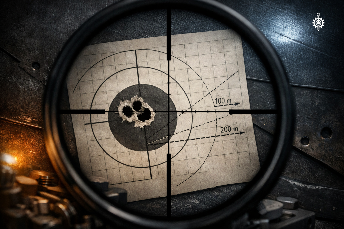 На стенде винтовка показывает точность в половину угловой минуты. На бумаге это геометрически идеальное оружие: при трёх выстрелах все пробоины укладываются в круг меньше трёх сантиметров на ста метрах. По такому результату паспорт, рекламный буклет и отчёт об испытаниях звучат одинаково: «точность 0,5 MOA». А потом эта же винтовка в поле, из положения лёжа с сошек, на шестистах метрах, при лёгком боковом ветре — промахивается мимо корпуса. И это не сбой системы. Это и есть система.