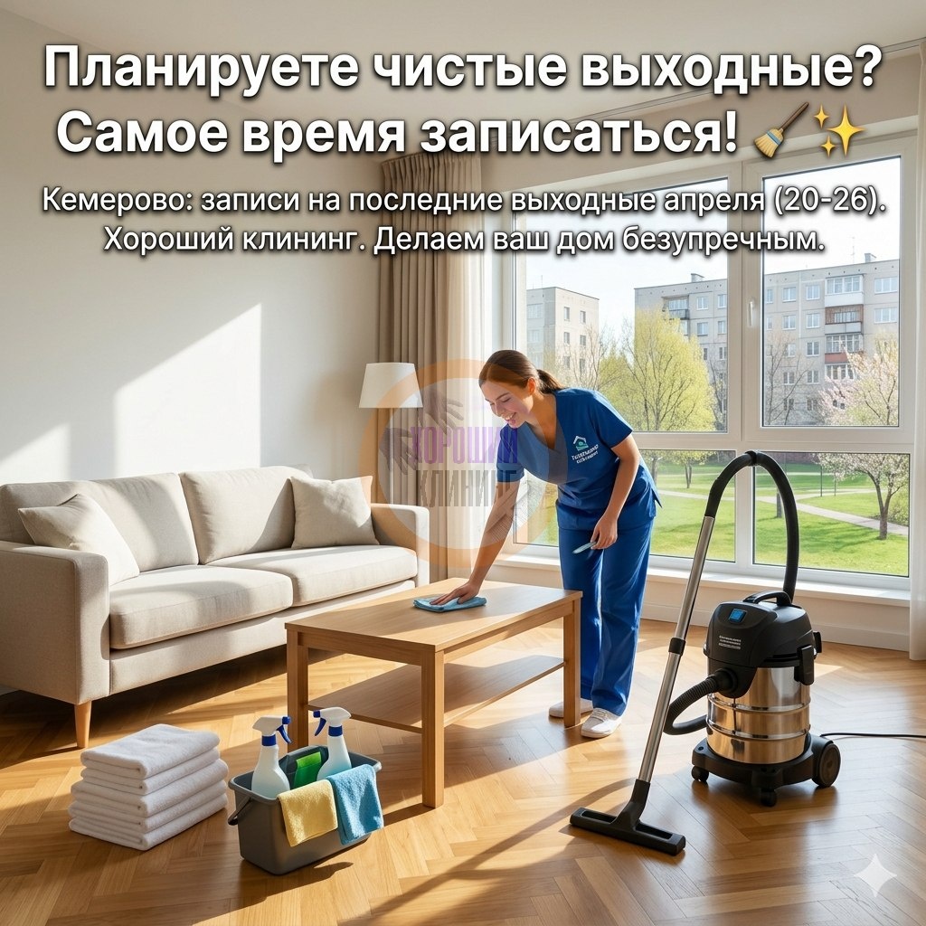 ! 🗓 Доброе утро! Друзья, врываемся в новую неделю и открываем запись на последнюю неделю апреля (20–26.04). Апрель пролетает быстро, а майские праздники уже не за горами. Встречайте их в идеальной чистоте без лишних усилий! Что мы можем сделать для вас на этой неделе: 🔹 Поддерживающая или генеральная уборка. 🔹 Химчистка диванов и матрасов. 🔹 Мытье окон (самое время!). Места на 20–26 апреля разлетаются быстро. Успейте занять удобное время! Записаться 👇 Отзывы в Яндекс.Картах | 2Гис Звоните: +7905-966-55-51 Татьяна Напишите в MAX или в Telegram Подпишитесь MAX | VK | Дзен | YouTube Хороший клининг