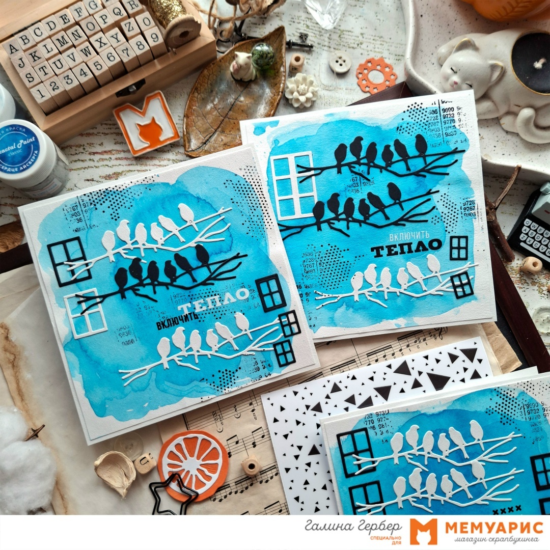 Привет-привет! В эфире Галя Гербер. Как у вас, включили тепло? Птички уже прилетели? У нас да. Именно их звонкие трели, а также наш новый скетч, вдохновили меня на создание добрых открыток. Для основы я взяла акварельный лист размером 13,5х13,5 см (таких заготовок мне понадобилось 6 шт, по 2 на каждую открытку). Для начала я поработала сухими красками от Fractal paint, выбрала оттенок «Сердце айсберга». Фоны специально не окрашивала полностью, оставляя белые края. В своих запасах я нашла нож с птичками, сидящими на ветках. Они и стали главной идеей открыток. К ним в компанию я вырубила окошки (сеты Мимикат «Дом, который построил Джек», «Дверь полуоткрыта»). Разместила их согласно скетчу. Для вырубки использовала белый акварельный лист и черный кардсток. Для заголовка решила применить триклейки от Paperrus, набор «Включить весну». На сочетании и контрасте черных и белых элементов построена вся работа. Завершили композицию фоновые штампы от Агиарт. Спинки открыток я тоже украсила. Они вп