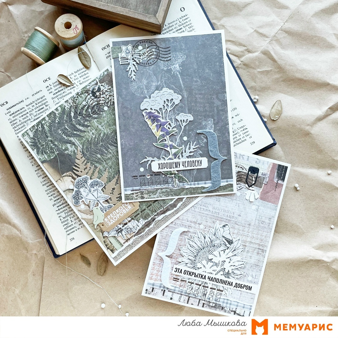 Привет всем добрым творческим! Хочу вас сегодня вдохновить на создание открыток для мужчин в рамках проекта #добрыеоткрытки_мемуарис. Я решила взяться за открытки для мужчин - это сложно, но возможно. И выбрала ботанику, ведь ботаническая тематика отлично сочетается с мужской. Получаются очень универсальные открытки. А еще создание таких открыток - отличный способ утилизации обрезков. Я взяла листы разных коллекций PaperHome. Основными элементами могут служить вырезалки, например, из этого листа. Украсила каждую открытку вырубкой ножами от Мимикат. Посмотрите, как классно выглядит «Пижма»! В качестве акцентов добавила почтовые штампы от Агиарт и триклейки. И, конечно же, не обошлось без надписей из говорилок «Добрые открытки». Вдохновляйтесь и творите свою красоту! • Всегда с лёгкой сумашедшинкой, Люба •