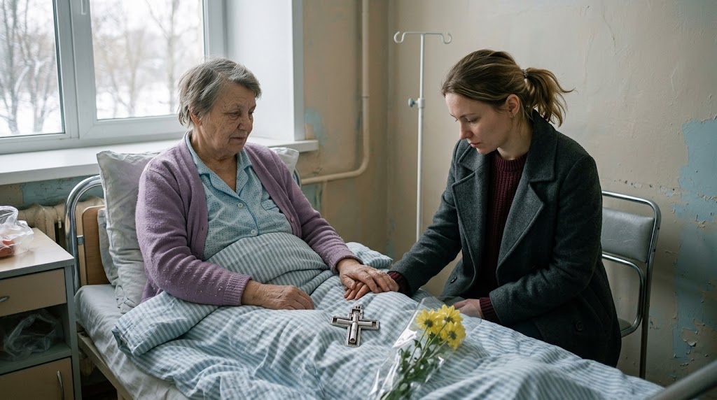 Нина сидела на кровати с чашкой. Соседка ушла на процедуру. Вера вошла, прикрыла за собой дверь. Положила ромашки поверх одеяла, рядом с Нининой рукой.