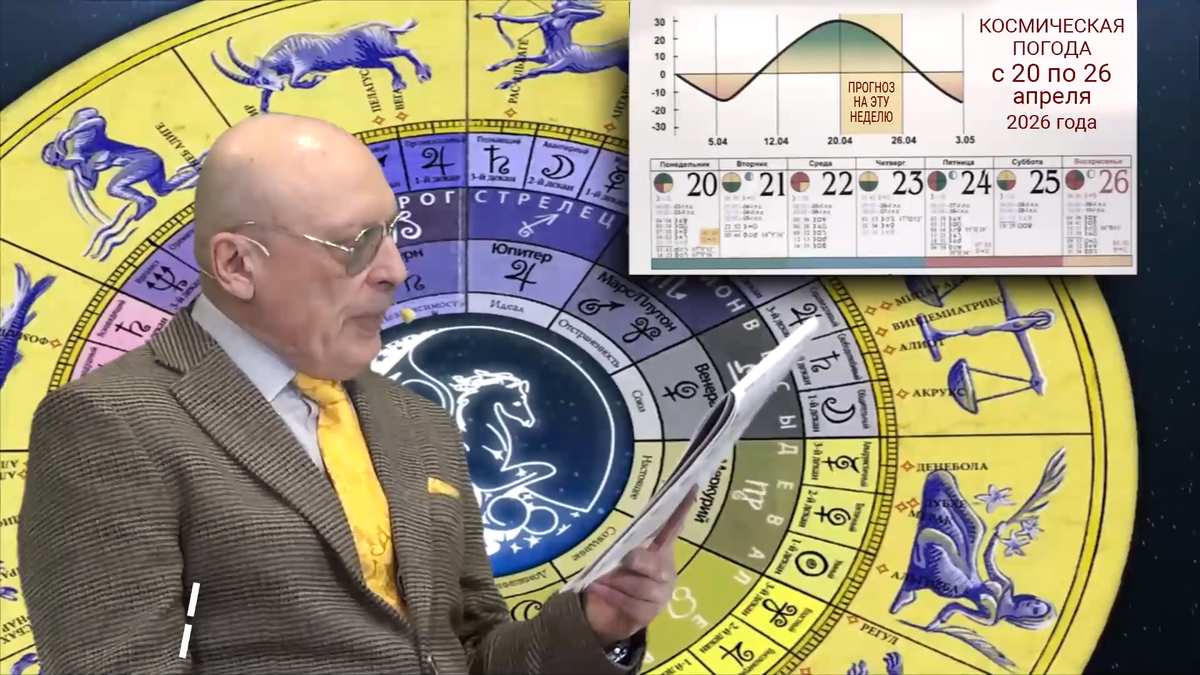 Новых интервью у Зараева нет, посмотрим, что он рассказывает про эту неделю с 20 по 26 апреля. Четвертая неделя апреля. Очень необычная неделя несмотря на это позитивное состояние биосферы на нее накладывается ряд труднопрогнозируемых сложных по энергетике аспектов, они бывают редко. Перечисляет аспекты понедельника. Утро этого дня у многих будет восприниматься, как больная голова или ощущение как-будто с похмелья проснулся. Как-будто медным тазом или каской накрыли. Зараев советует в воскресенье как следует выспаться. А иначе в первую половину дня настроение будет депрессивным. Здесь смена полей, Солнце покидает Овен, входит в Тельца. Всех Тельцов с наступающим днем рождения! Понедельник запускает программу доминирования знаков Земли, Козерогов, Дев и Тельцов, и Воды. Знакам Воздуха и Огня нужно сбавить свою активность. И нельзя слишком много общаться. Почему? Называет аспект. Он означает, что весь день 20 числа вы будете вспоминать, что слово - не воробей, вылетит - не поймаешь