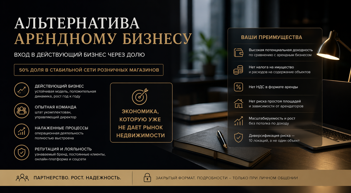Потому что они не про “продать”, а про “найти партнера”. Сейчас в работе — вход в действующий бизнес через долю 50%.