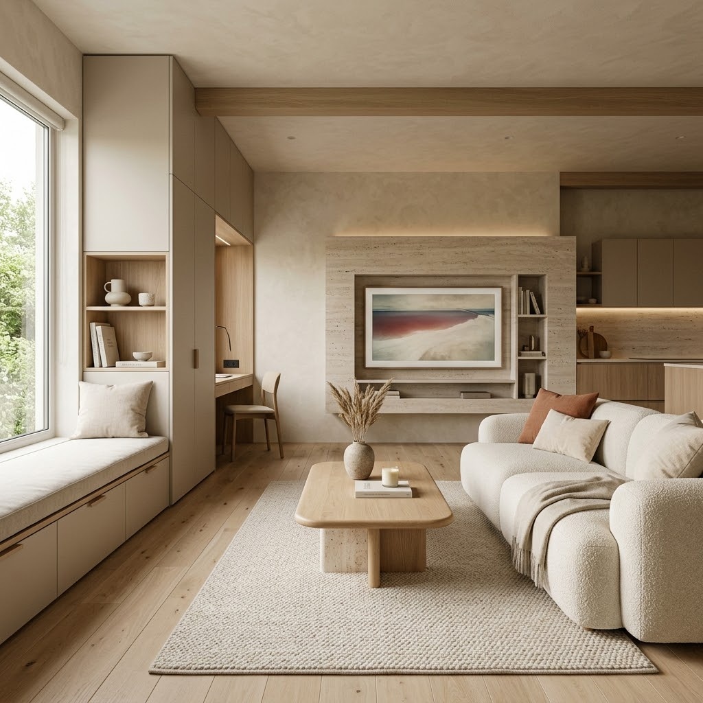 Тёплый минимализм — это не «пусто», а «ровно столько, сколько нужно». Дорогой эффект создают большие спокойные плоскости, аккуратные стыки и понятная логика хранения.