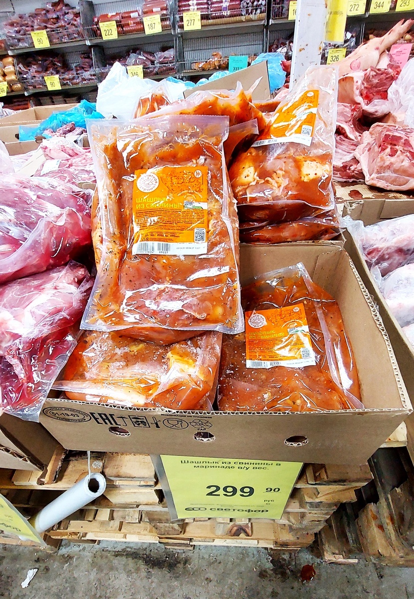 Так во время заехала в "Светофор", застала разгрузку нового поступления - Шашлык из свинины мелкокусковой, бескостный, замороженный, ТМ "Аппетитная страна". Хороший вариант для пикника. Продукт в вакуумной упаковке, весовой. Цена 299,9 рублей.