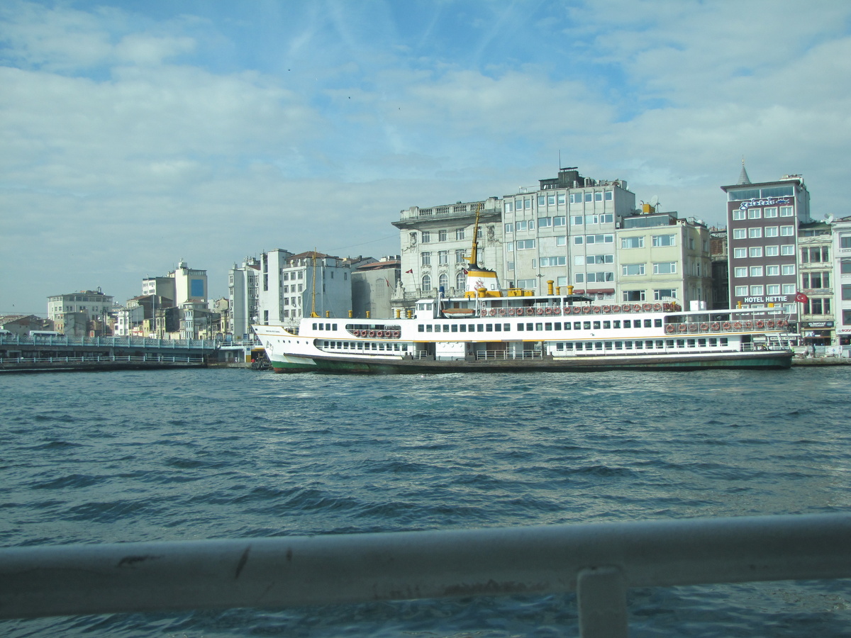 На наше счастье, мы увидели большой корабль, он тоже оказался экскурсионным (2-часовая прогулка по Босфору). Судно большое, двухпалубное, качка совсем не ощущалась. Верхняя палуба открытая, как раз припекало солнце и весь народ находился там. Мест не было, пришлось спуститься вниз. Внизу стояли большие круглые столы, покрытые скатертями, на окнах висели занавески, а в конце зала находился бар. Заказали кофе. Мы сели за стол у окна и стали наслаждаться потрясающими видами за окном. Прогулка на корабле нам понравилась.