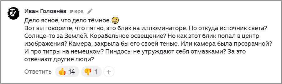 Блик на иллюминаторе от освещения внутри космического корабля. Тут другой вопрос – почему Рид Уйазмен (автор снимка) не сделал фото объективом вплотную к иллюминатору? Тогда блика на снимке не было бы. Или чуть изменил бы точку съёмки, чтобы световой блик ушёл за пределы иллюминатора, как это сделано на втором фото.