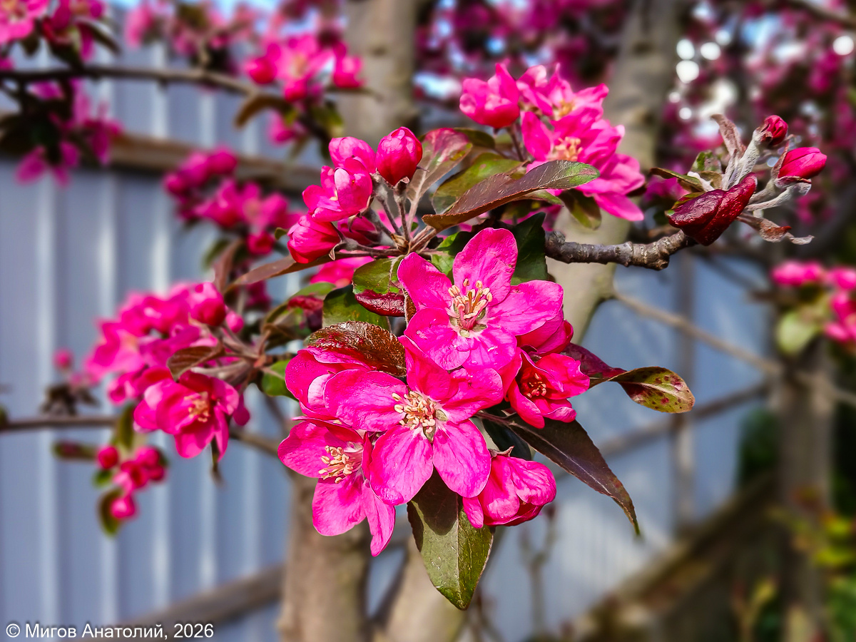 У нас цветут декоративные яблони. Цвет лепестков сумасшедший. Мне очень нравится, как цветёт хеномелес, она же японская айва. Но вот эта яблонька будет покруче. Мы и покупали их чисто для красоты. А потом оказалось, что яблочки у них вполне съедобны и даже вкусны. Мелкие только. Нас часто спрашивают о сорте этой яблони и в каком питомнике мы её покупали? Отвечаю: покупали в 2017 г. в питомнике Волковых, село Донское под Симферополем. А что за сорт, сказать не можем, давно дело было, не обратили на это внимание, а может быть и просто она так и называлась "декоративная яблоня", поскольку была только одна эта разновидность. Из окна моего кабинета сейчас замечательный вид на эту цветущую яблоню и на оранжевые цветы царской короны, он же рябчик императорский. Не успели яблоньки зацвести, как наш городок Старый Крым накрыло градом. Второй уже раз за эту весну. Хорошо ещё, что град был хоть и частый, но мелкий как горох. И сыпал недолго, всего два коротких заряда. Никто из растений и животных