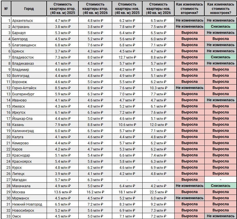 Готовлю материалы по индексу доступности жилья. У меня своя методология, учитывающая множество факторов. Пока что покрываю 65 городов, но планирую расшириться до 75-80 городов: поступали заявки от жителей Пскова, Новгорода, Вологды, Костромы и Новороссийска на добавление в индекс доступности жилья. Если вы хотите, то также можете в комментариях оставить пожелание о добавлении своего города. А пока что смотрите, что по динамике стоимости квартир получается: Данные о стоимости квадратного метра взяты из Домклик: https://blog.domclick.ru/analytics/detailed/offers/moskva-grafik-1-komnata?periodStart=2026-03-01&topSlug=offers_med_square_price Расчет стоимости квартиры упрощён: берется медианная цена квадратного метра от Домклик и умножается на 40 кв. метров. Если цена осталась в диапазоне +/-5% - выставлен статус "Не изменилась". Рост более чем на 5% - поставлен статус "Выросла", снижение более чем на 5% - поставлен статус "Снизилась". В целом, по моему городу - Санкт-Петербургу - данные ре