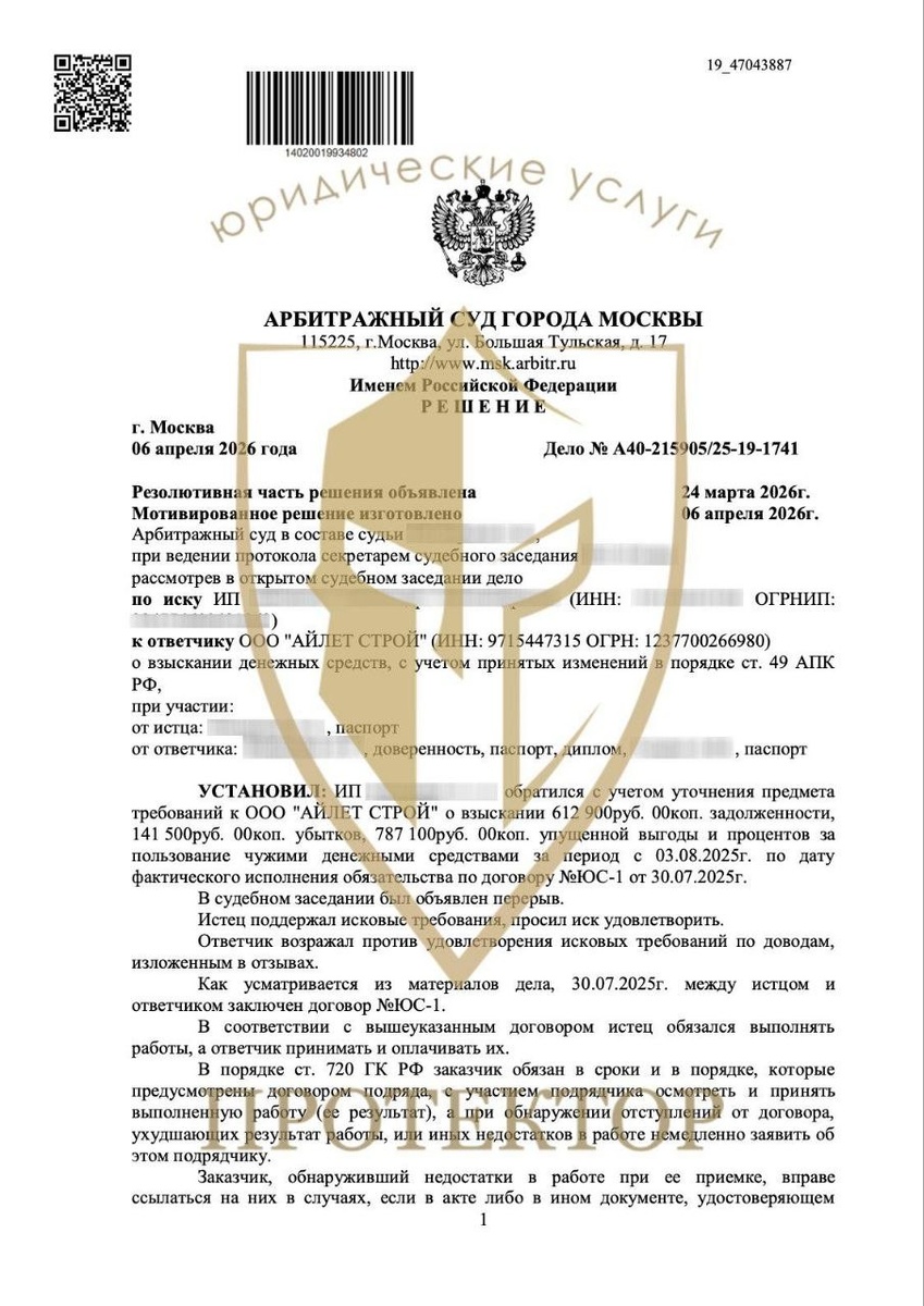 " 🏛️ Более 2 млн рублей убытков отклонено Арбитражным судом в пользу нашего доверителя 🗂️ С чем обратились: В ЮК "Протектор" обратился генеральный директор компании, у которой был заключён договор бригадного подряда. Обязательства по этому договору своевременно не были исполнены, из-за чего доверитель расторг его в одностороннем порядке. На клиента подали иск с целью взыскания убытков в размере более 2 000 000 рублей. 🛡️ Что сделали: Юристы компании «Протектор» подготовили правовую позицию, собрали доказательства отсутствия вины доверителя, опровергли доводы истца и грамотно выстроили линию защиты в Арбитражном суде г. Москвы. 🤝 Результат: ✅ Предъявляемые к клиенту исковые требования не были удовлетворены. Суд завершился в пользу нашего доверителя. «Протектор» — надёжная защита вашего бизнеса. У вас возник спор? С практикой нашей компании вы можете ознакомиться тут ❗️Записаться на консультацию можно позвонив по номеру: +7-999-337-64-67 или написав в Телеграмм @mProtektor