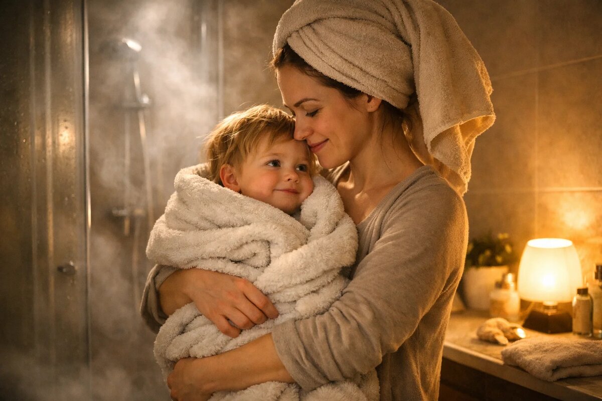 - Обеспечить доступ прохладного влажного воздуха. Откройте окно (даже зимой — на несколько минут) или выведите ребёнка на балкон, предварительно укутав. Прохладный воздух снимает отёк. Другой вариант — включить горячую воду в ванной и посидеть с ребёнком во влажном тёплом воздухе 10–15 минут.