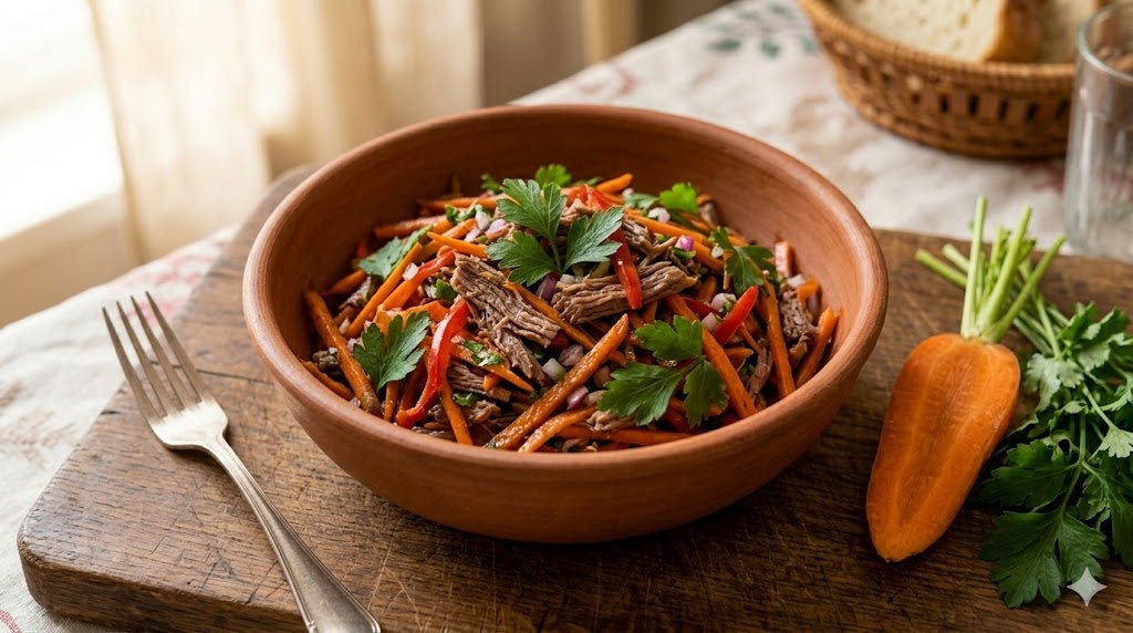 🌿 Веганская версия салата: убрать говядину, добавить 200 г варёного нута. Белок сохраняется, текстура меняется, но салат остаётся сытным. Зира с нутом работает не хуже, чем с мясом.