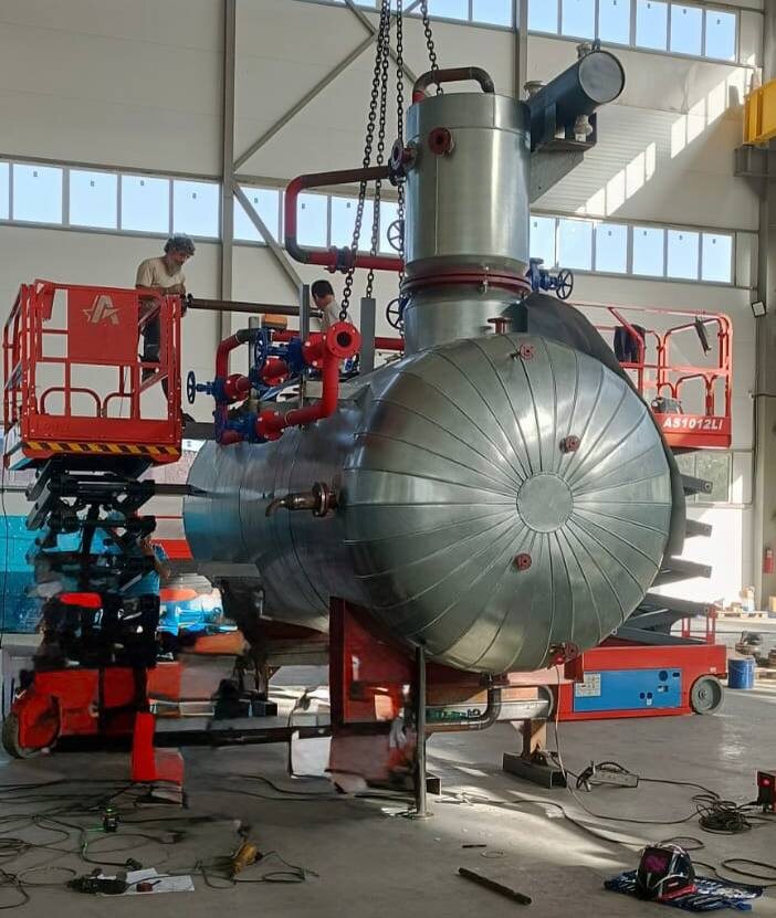 Краснодарский котельный завод завершил сборку мощного и функционального атмосферного деаэратора линейки Atomizer. Устройство прошло заключительный этап производства, включая монтаж всех необходимых компонентов и защитную обшивку корпуса.