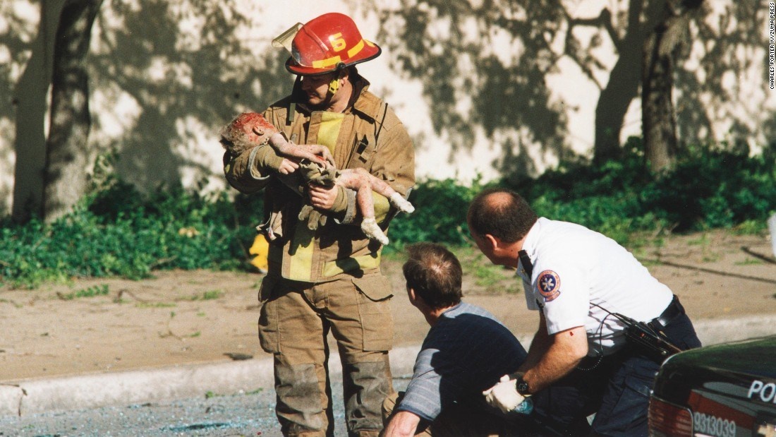 На этом снимке пожарный выносит из руин раненую девочку. Накануне ей исполнился всего год. 19 апреля 1995 года, 9:02 утра, Оклахома-Сити. Начинённый взрывчаткой грузовик у 9-этажного здания. Взрывом срезает треть дома. На втором этаже – детский сад. Из 21 ребёнка выживут шестеро. Всего погибнут 168 человек. Крис Филдс работает пожарным на станции в 17 кварталах оттуда. Ударная волна бьёт по пожарной станции, с полок летят папки с документами. Филдс видит столб дыма и выезжает с бригадой, не дожидаясь вызова. На месте к нему подбегает полицейский с ребёнком на руках и кричит: «Младенец ранен!» Филдс снимает грубые пожарные перчатки и принимает девочку. Проверяет пульс – не находит. Несёт к скорой, но носилки и машины заняты. Он стоит и ждёт, пока на землю расстелят одеяло. В этот момент Чарльз Портер, 25-летний банковский служащий из здания через дорогу, нажимает на спуск фотоаппарата. Он не понимает, что снимает. Проявит плёнку в магазине, по совету друга отнесёт её в информационное аг
